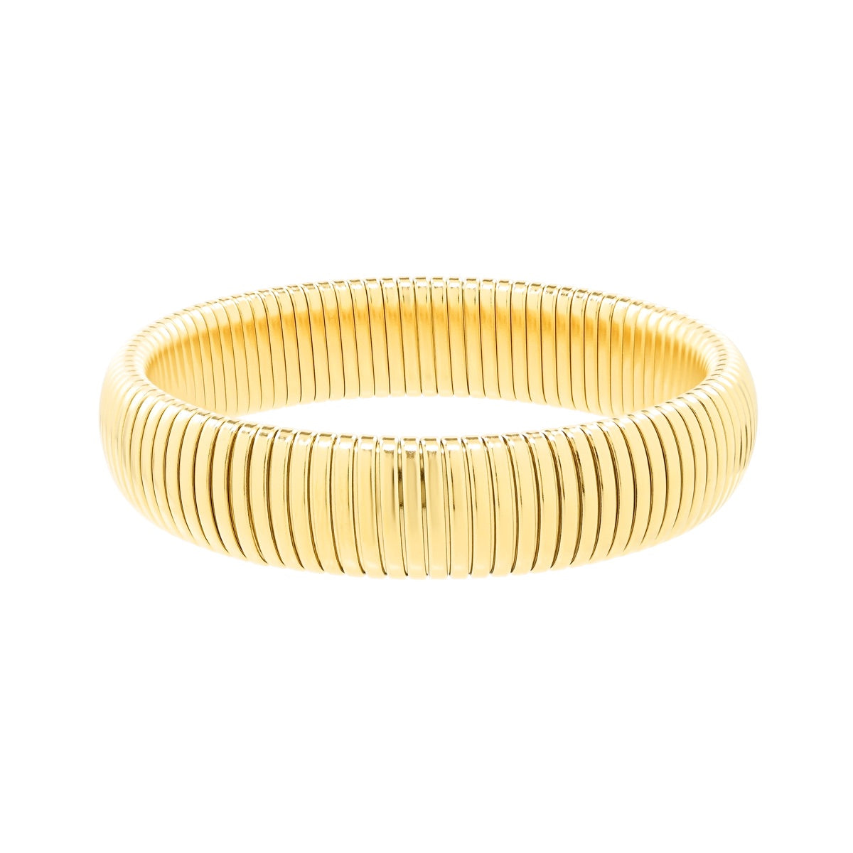 This bold bangle features a sleek, ribbed coiled design in polished gold-tone for a modern yet timeless vibe. Its luxe texture catches the light, adding a sophisticated edge to any look. Perfect for elevating both casual and dressy outfits, it's a must-have statement piece.