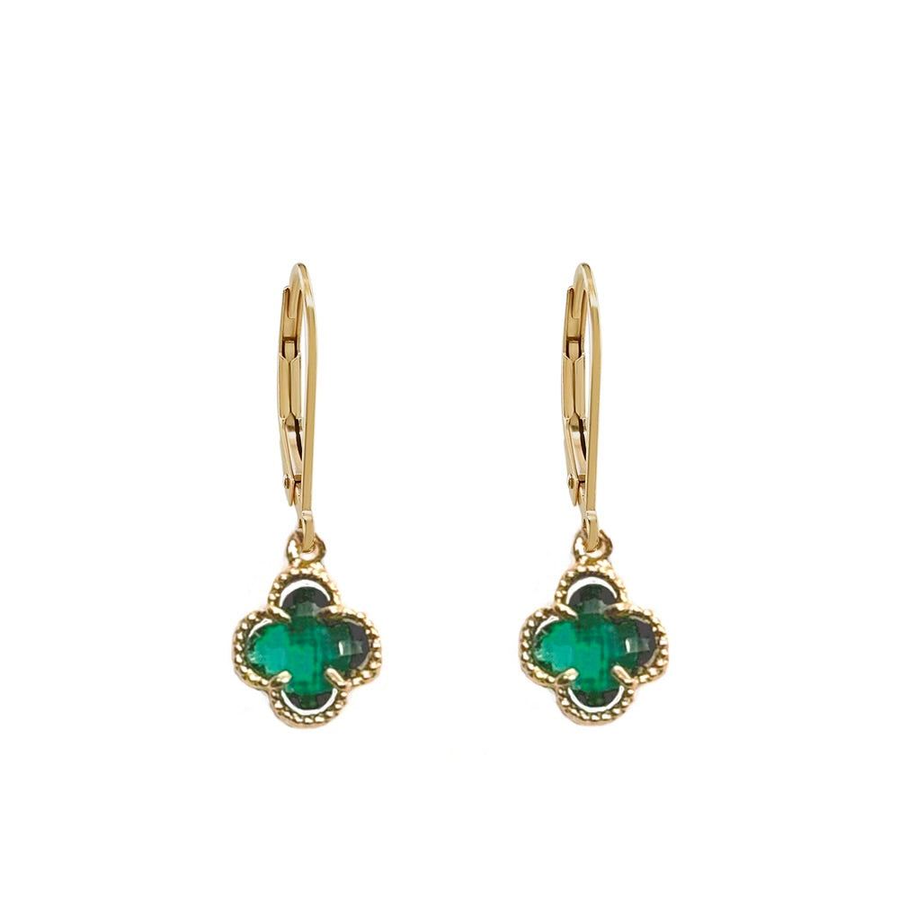 Add a touch of luck and luxe to your everyday look with these dainty green clover leverback earrings. Set in radiant gold, the rich green stone brings a subtle pop of color that’s effortlessly chic from day to night.